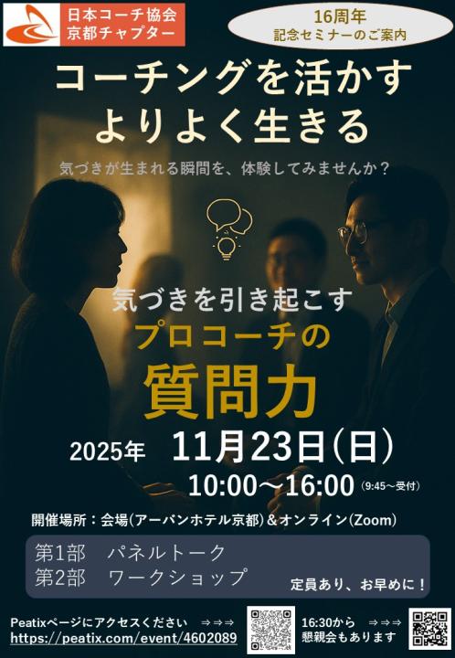 - A ありがとうございます。もちろん大歓迎です。京都チャプターのセミナーには会員でない方でもお気軽にご参加いただけます。「コーチングを知りたい」「体験したい」方、 「もっと勉強したい」方、「今抱えている問題解決のためのヒントを得たい」方……いろいろな方が参加されています。いずれの場合も、セミナー参加をクリックしPeatixのフォームでお申込みください。お会いできることを楽しみにしております。
