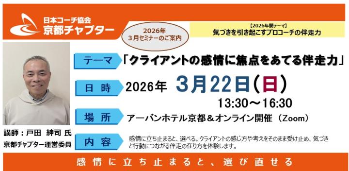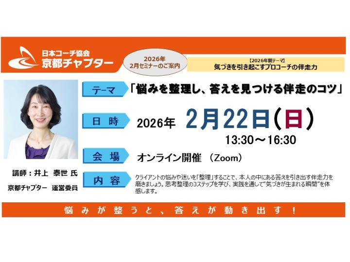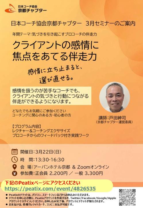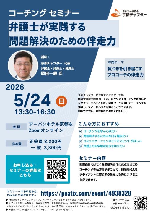 - A ありがとうございます。もちろん大歓迎です。京都チャプターのセミナーには会員でない方でもお気軽にご参加いただけます。「コーチングを知りたい」「体験したい」方、 「もっと勉強したい」方、「今抱えている問題解決のためのヒントを得たい」方……いろいろな方が参加されています。いずれの場合も、セミナー参加をクリックしPeatixのフォームでお申込みください。お会いできることを楽しみにしております。