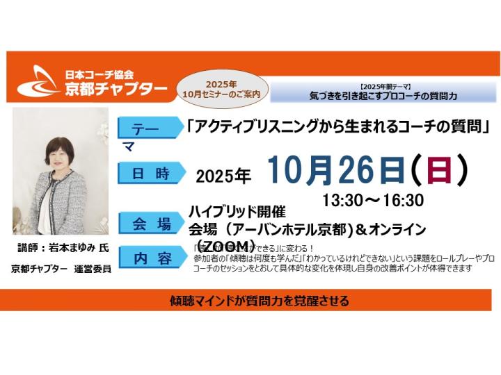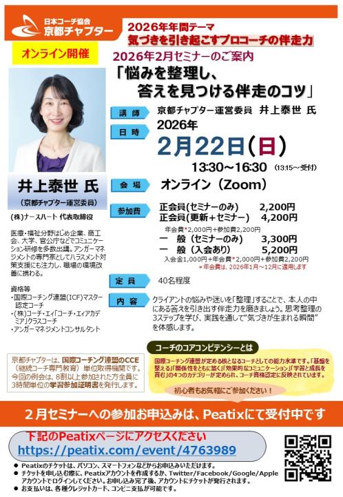 - A ありがとうございます。もちろん大歓迎です。京都チャプターのセミナーには会員でない方でもお気軽にご参加いただけます。「コーチングを知りたい」「体験したい」方、 「もっと勉強したい」方、「今抱えている問題解決のためのヒントを得たい」方……いろいろな方が参加されています。いずれの場合も、セミナー参加をクリックしPeatixのフォームでお申込みください。お会いできることを楽しみにしております。